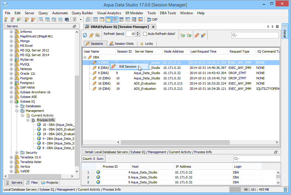 Aqua Data Studio offers a suite of Sybase IQ DBA Tools for the monitoring, maintaining and tuning of the Sybase server. It includes an Instance Manager, Storage Manager, Security Manager, and Session Manager. These managers allow the monitoring and maintenance of Database Objects, Sessions, Users and Permissions via GUI.
